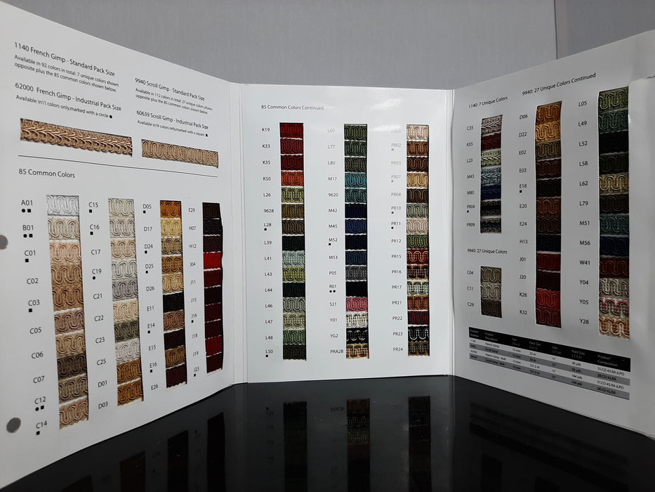 SCROLL GIMP IS USED TO COVER THE TACKS THAT FASTEN UPHOLSTERY MATERIAL TO EXPOSED WOODWORK. CURRENTLY AVAILABLE IN 112 COLORS MATCHING MOST COLORS FABRICS
